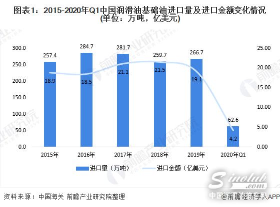 进口方面,据中国海关数据显示,2019年,我国基础油进口量为266.66万吨,进口金额为266.66亿美元,均较2018年有所增长。2020年1季度,我国基础油进口量为62.57万吨,进口金额为62.57亿美元。