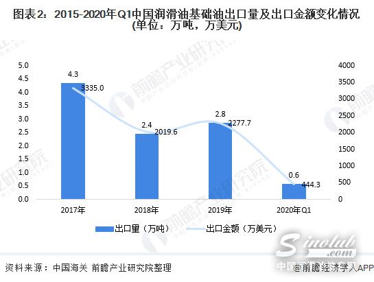 出口方面,据中国海关数据显示,2017-2019年间,我国润滑油基础油出口量和出口金额均呈波动下降趋势。2019年,我国基础油出口量为2.8万吨,出口金额为2277.7万美元,均较2018年有所增长。2020年1季度,我国基础油出口量为0.6万吨,出口金额为444.3万美元。