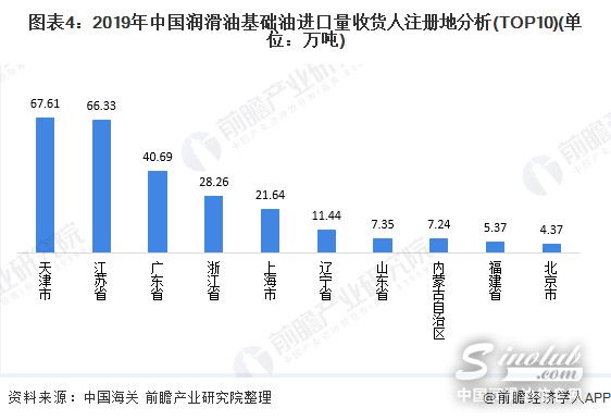 进口量按收发货人注册地来看,2019年,我国天津市的润滑油基础油进口量最大,达67.61万吨,占比总进口量的25.4%;其次是江苏省,进口量达66.33万吨,占比约24.9%。