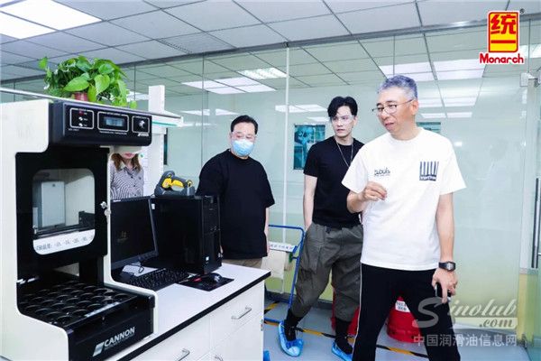 统一石化技术研发及实验室主管向经超等人介绍高精尖的仪器设备,T-Lab正是依靠它们不断探索研究能效润滑科技,研发出领先的车用产品,为万千车主司机服务。