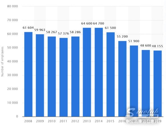 雪佛龙2008-2019雇员人数(来自Statista)