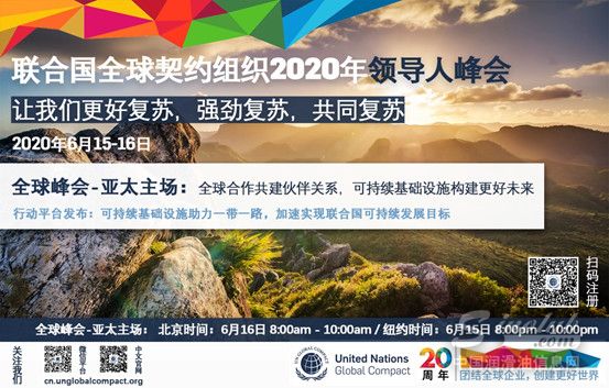 纽约时间6月15至16日,联合国全球契约组织将首次采用线上形式,举办2020年领导人峰会暨二十周年庆典。会议将体现出多个亮点特色,覆盖全球五大洲,24小时不间断举办,为全球参会者呈献独一无二的峰会体验。