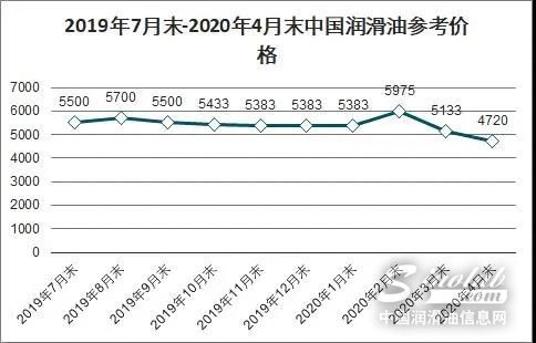 2019年下半年,我国润滑油参考价维持在5383-5700元/吨之间,价格较为稳定。2020年1-4月,受新型冠状肺炎疫情影响,润滑油价格下滑,2020年4月末,润滑油参考价为4720元吨。