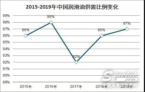 2015-2019年,我国润滑油供需比例均小于1,说明近几年我国的润滑油市场供给量小于市场需求量。其中,2017年以后,我国供需比例逐步提高,至2019年,供需比例达97%。