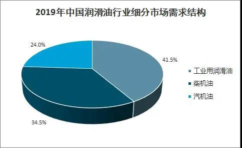 2019年,车用润滑油约占润滑油消费总量的58.5%,工业润滑油约占润滑油消费总量的41.5%。车用润滑油的细分产品中,柴机油需求占润滑油比约34.5%,汽机油需求占比约24%。