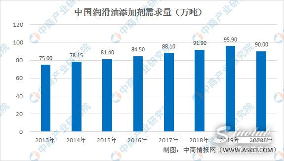 中国巨大的润滑油消费潜力拉动了润滑油添加剂的需求。作为全球最大的润滑油消费国之一,我国润滑油添加剂的需求量由2013年的75万吨增长到2018年的91.9万吨,年均增长率为4.2%。今年受新冠疫情影响,我国汽车市场放缓,据中国汽车工业协会最新预测,2020年中国汽车销量将下降10%至20%。受此影响,我国润滑油添加剂需求量也随之下降,中商产业研究院预测,2020年中国润滑油添加剂需求量约90万吨左右。