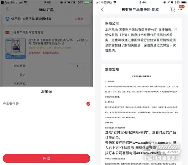 以天猫养车零配件官方直营店为例:平台上机油大多赠送产品责任险,覆盖面较广。在付款页面,直接显示“淘车保”产品责任险,点击进入,可以浏览具体条款。