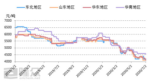 2020年已过近半,截止6月,国内基础油150N的均价在4100元/吨,价格处于下行态势,高点出现在1月初,最低值还在发展中。2020年的价格变化与往年差异较大,2019年是第一季度需求平缓时,价格居高维稳,第二季度,新增装置投产,供应面剧增,出现价格下落,进入6月检修期之后,价格小幅回调,2020年则呈现梯度式下落,至今未见最低点。