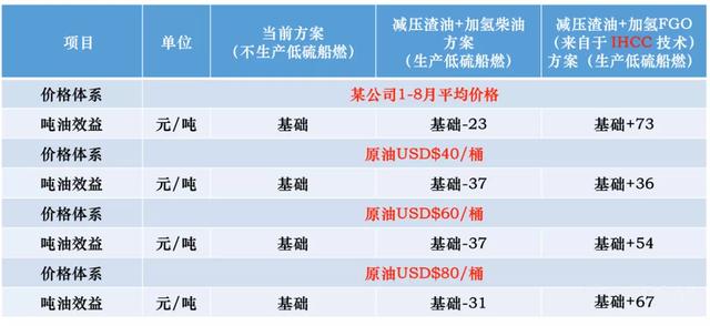 目前市场上低硫船燃供应有限,预计2020年低硫船燃需求量在1.35亿吨左右,供应缺口在40%左右。炼厂生产低硫船燃有广阔的市场空间,优化并选用合适的加工路线生产低硫船燃将给炼厂带来巨大的经济效益。石油化工科学研究院(石科院)研究了不同低硫船燃生产方案对炼厂经济性的影响,比较了在多种原油价格体系下采用不同加工方案的吨油效益,分析表明,不同的生产方案对经济性影响巨大。在本案例中,采用来自于IHCC技术的加氢催化裂化蜡油(FGO)与减压渣油调和生产低硫船燃,比采用减压渣油和加氢柴油调和生产低硫船燃的效益更高,效益主要来自于IHCC技术提高了烯烃产率。