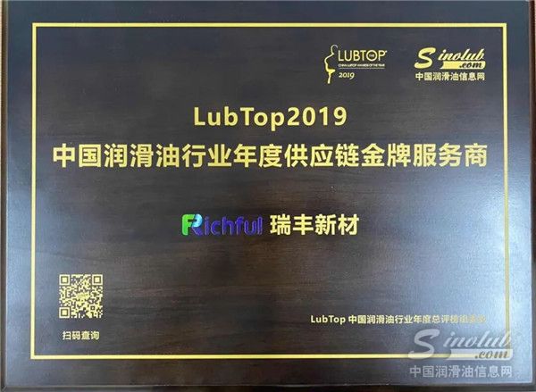 “LubTop 中国润滑油行业年度总评榜”于7月20日隆重揭晓,瑞丰新材不负众望,再次荣获“中国润滑油行业年度供应链金牌服务商”大奖,感谢行业对瑞丰的支持与认可,获奖,更是对我们的鼓励和鞭策!