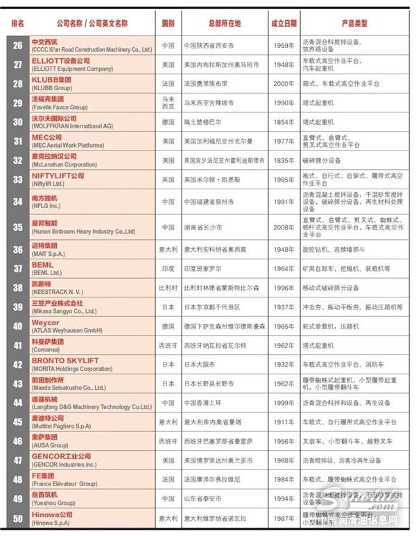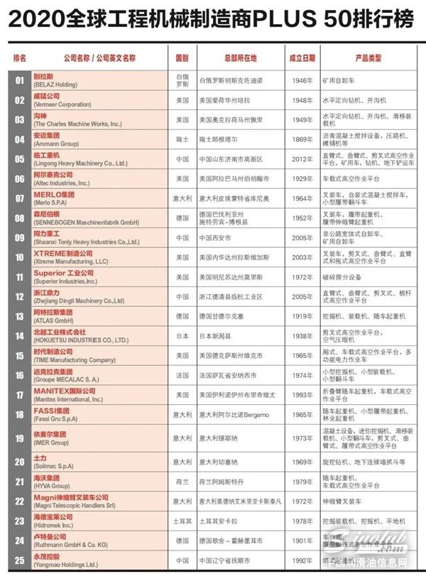 2020年全球工程机械制造商PLUS 50强(即全球工程机械行业排名第51-100位的制造企业)近日发布。
