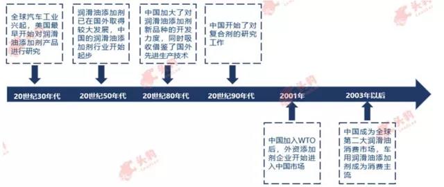 20世纪30年代后,全球汽车工业开始兴起,发动机逐渐向大功率方向发展,润滑油添加剂需求不断加大。1935年,美国开特皮勒公司和加利福尼亚研究公司共同展开了对润滑油添加剂研究,到20世纪50年代,国外已取得较大发展,而国内市场起步较晚,20世纪50年代末期,对润滑油添加剂的系统性研发才正式开启。