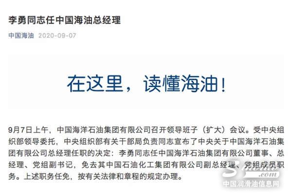 9月7晚间,中国海油官微消息称,李勇出任中国海洋石油集团有限公司总经理、党组副书记,免去其中国石油化工集团有限公司副总经理、党组成员职务。