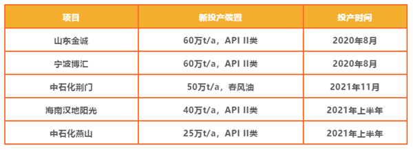 在2020年前期山东金诚石化、宁波博汇石化等炼厂开工的基础上,中国石化荆门石化50万吨春风油系列加工装置已于11月正式投产,产出变压器油、冷冻机油、低温开关油等系列产品,上述产能将在2021年持续释放。