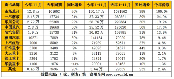 而在今年疫情的大背景下,重卡销售市场不仅没有出现销售下滑,反而逆势而上。据相关部门统计,今年1-11月,我国重卡市场累计销售150.17万辆,同比增长39%,净增长超42万辆,再创同期重卡销量的新纪录。1-11月累计销量前十企业全部实现同比增长,并且涨幅均达到两位数。