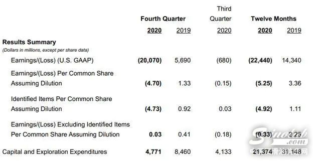 该公司宣布,预计2020年第四季度亏损201亿美元,若稀释后每股亏损4.70美元。第四季度的资本和勘探支出为48亿美元,全年支出为214亿美元,比去年同期减少了98亿美元。