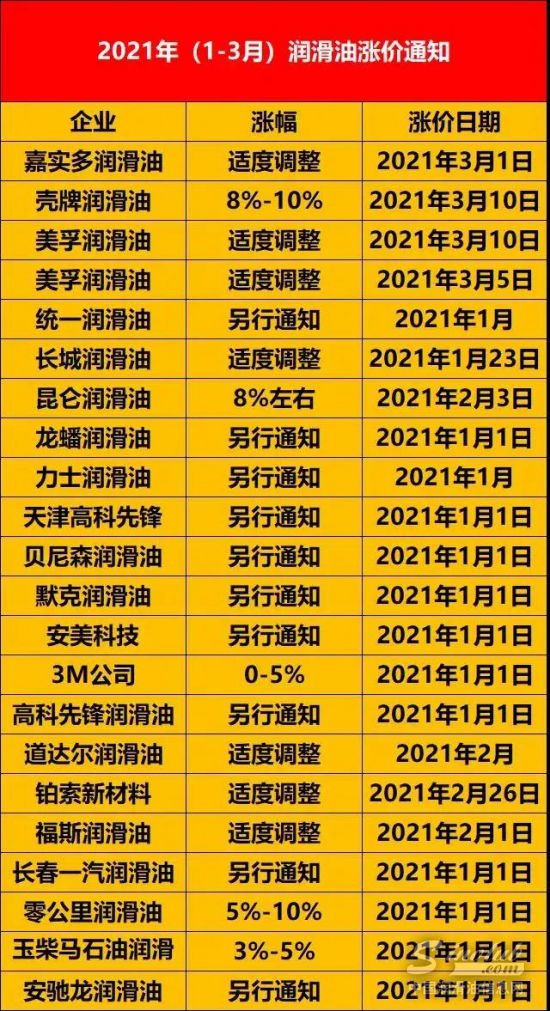 据不完全统计,目前已经二十几家润滑油厂家发布了涨价通知单,并且这其中不乏有重复多次发布涨价通知的润滑油厂。有媒体表示,2021年开年来,润滑油行业似乎正在进行着新一轮的涨价形式。