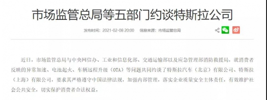 也正因如此,2月8日晚间,国家市场监管总局官网发布消息,国家市场监督管理总局与中央网信办、工业和信息化部、交通运输部以及应急管理部消防救援局,就消费者反映的异常加速、电池起火、车辆远程升级(OTA)等问题共同约谈了特斯拉汽车(北京)有限公司、特斯拉(上海)有限公司。