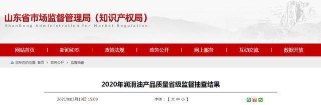 2021年3月19日,山东省市场监督管理局网站公布2020年润滑油产品质量省级监督抽查结果。本次共抽查了全省41家企业生产/销售的61批次润滑油产品,其中,生产领域38家企业57批次,流通领域3家企业4批次。发现4批次产品不符合相关标准的要求,不合格项目为低温动力黏度、泡沫性项目。