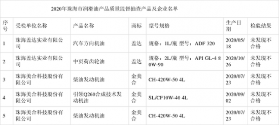 近日,广东省珠海市市场监管局通报2020年珠海市润滑油产品质量监督抽查结果。2020年第四季度,珠海市市场监管局组织开展了润滑油产品质量监督抽查。本次共抽查了2家企业生产销售的5批次产品,检验未发现不合格样品。