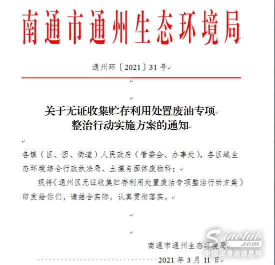 由于无危险废物经营许可证的单位(个体户)的非法收集、贮存、利用、处置废油及废油桶的违法行为游离于监管之外,存在环境风险隐患,可能造成土壤和水体污染。为进一步堵塞污染源头,防范环境风险,严厉打击环境违法行为,今年3月,南通市通州生态环境局在全区范围内开展了无证收集贮存利用处置废油专项整治行动。