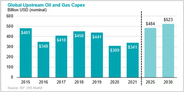 近日,国际能源论坛(IEF)和知名咨询机构IHS Markit在一份新报告中表示,为确保市场供需平衡,油气上游投资需要增加,并维持在5230亿美元的水平,直到2030年。报告指出,油气行业的上游投资在2021年连续第二年下降,为3410亿美元,比2019年水平低近25%。与此同时,石油和天然气需求目前接近大流行前的高点,并将在未来几年继续上升,特别是在发展中国家。
