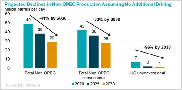 到2030年如果没有进一步的上游资本支出投资,当前非欧佩克的产量将减少2000万桶/天。