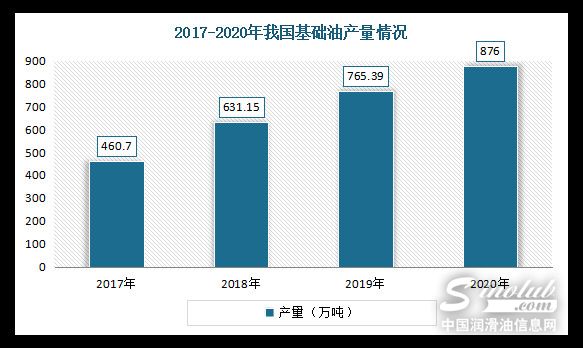 随着产能逐年递增,国内基础油产量也在不断增长。根据数据显示,2020年我国基础油产量从2017年的460.7万吨提升到876万吨,期间产量年均增速达23.89%。