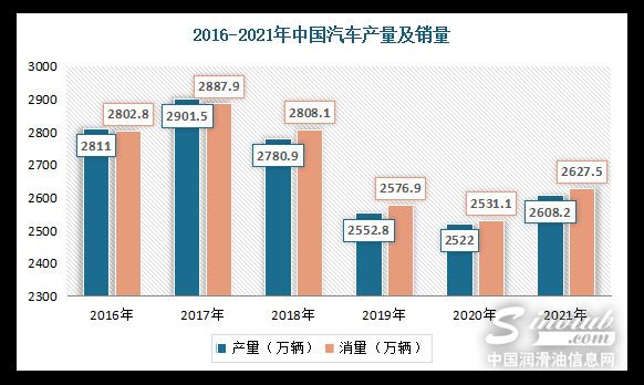 车用润滑油市场需求随我国汽车保有量的变化而变化。虽然近几年来,汽车市场发展放缓。但预计随着我国经济社会的稳步发展,群众购车刚性需求旺盛,加上新能源汽车对消费的刺激,汽车保有量仍将保持快速增长,由此将同时促进的车用润滑油市场持续增长。根据数据显示,2021年全年,我国汽车产销量分别为2608.2万辆和2627.5万辆,同比增长3.4%和3.8%。