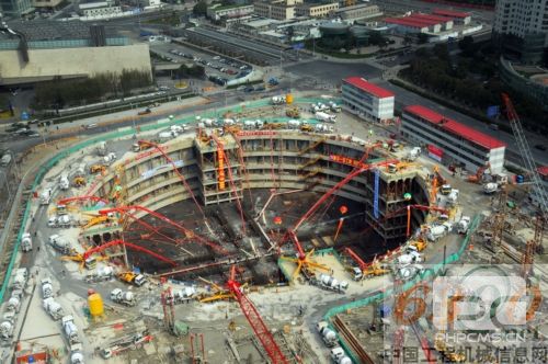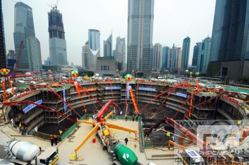 毗邻的上海环球金融中心混凝土工程总方量为23万多方,而上海中心一次性底板浇注量就相当于泵送了四分之一个“环球”。