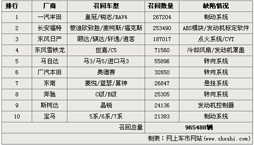 1、十大厂商召回近百万辆问题车
