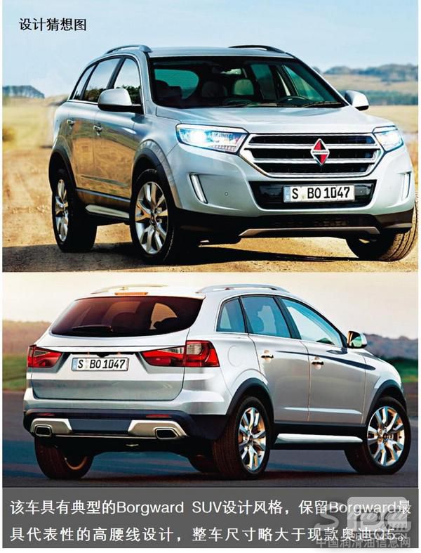 德国媒体不仅曝光了整车设计猜想图片,还透露这款SUV将有柴油款(150PS以上)、汽油款(四缸和六缸)、插入式混合动力(根据Borgward的说明,纯电力可以行使50公里)。