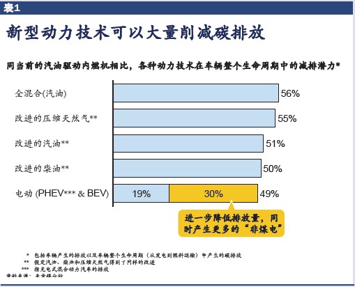 改良型汽油和柴油动力汽车: ■传统内燃机 (ICE) 汽车采用了减排技术, 如采用有助于引擎高效燃油的可变换阀门控制,通过降低摩擦节约燃料的低滚动阻力轮胎.在中国,改良型内燃机动力汽车在其生命周期中可能减少51%的碳排放量 (表1).
