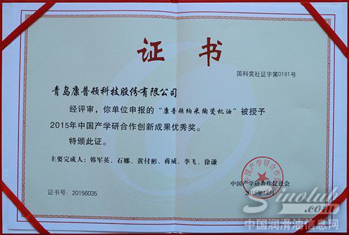 由青岛康普顿科技股份有限公司自主研发的康普顿纳米陶瓷机油荣获了“2015产学研合作促进会创新成果优秀奖”。康普顿副总经理焦广宇代表康普顿公司出席会议并领奖。同时获奖企业还包括中国石油、总装备部、云天化、人民电器、浙江大学等领军企业及高校院所。