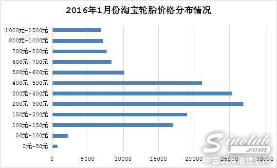2016年1月,线上轮胎的销售价格基本维持不变,从150元到1500元不等,而200-500元的轮胎价格区间依旧最受消费者欢迎。本月轮胎200-300、300-400、400-500元的成交量均突破20000件大关,其中,200-300元的轮胎销量更是突破25000件。由此看出,平民化的价格仍然最受消费者的欢迎。
