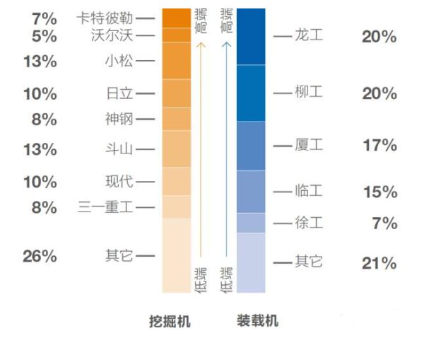 中国的挖掘机市场主要由国际OEM 占领,而装载机市场则由中国本土 OEM 主导。