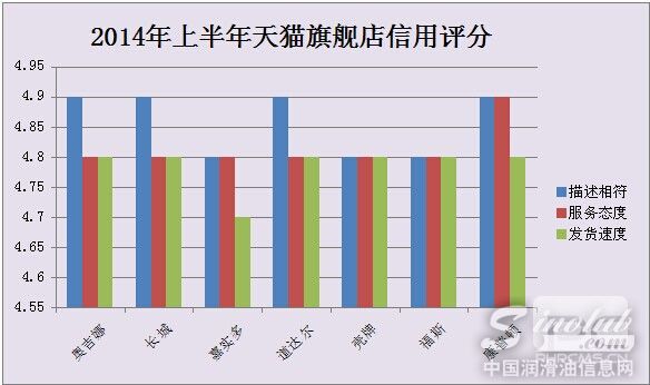 2014年上半年畅销机油天猫旗舰店的信用评分与2013年大体不变。无论是产品描述相符程度,还是商家服务态度或发货速度,均维持在较高的分数水平。从打分和评价上可以看出,消费者对于官方旗舰店有很高的信任度,相信产品的品质,并且对咨询、购买及售后的整个流程基本满意,期望加大产品促销力度,丰富完善现有的线上服务。