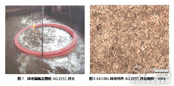 最近的一个使用实例是用于处理风电偏航轴承套圈(图7)及风电主轴的调质热处理。这类零件一般选用有一定淬透性的中碳合金结构钢,例如42CrMo(AISI 4140)、40CrNiMo(AISI 4340),要求有高的低温冲击韧性(-20℃和-40℃)和其它相关机械性能。经5-7% AQ 251 C淬火后,测定到希望的48HRC硬度处的淬硬层深度可达50mm左右。组织显示可得到理想的马氏体淬火组织形貌(图8),性能也是极其令人满意的(表2)。