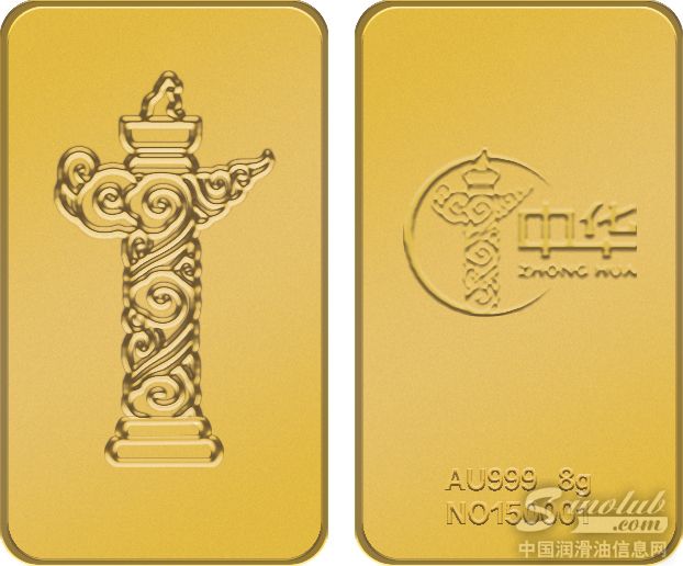 图:中华润滑油定制、由国家权威机构认证的AUG9999足赤金条“金耀中华”。