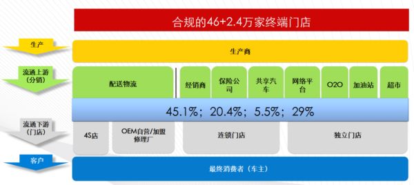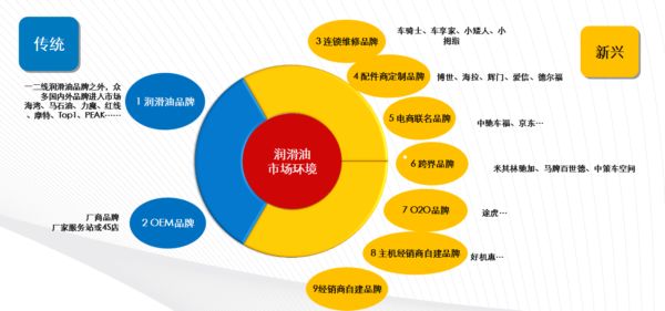 品牌方面,传统的润滑油市场是泾渭分明的“二分法”:润滑油品牌+OEM品牌。新兴的润滑油市场可谓“百家争鸣”,除上述二者,还延伸出连锁维修品牌、配件商定制品牌、电商联名品牌、经销商自建品牌等。渠道方面,从生产商到终端消费者,在流通上游有配送物流、经销商、保险、共享汽车、网络平台、O2O、加油站、超市。在流通下游,有4S店、OEM自营/加盟修理厂、连锁门店、独立门店。