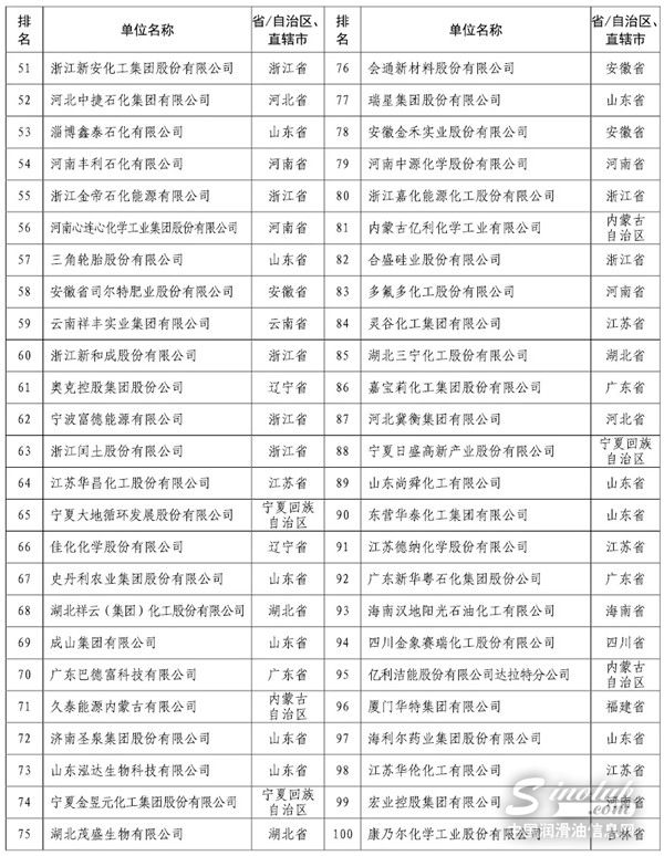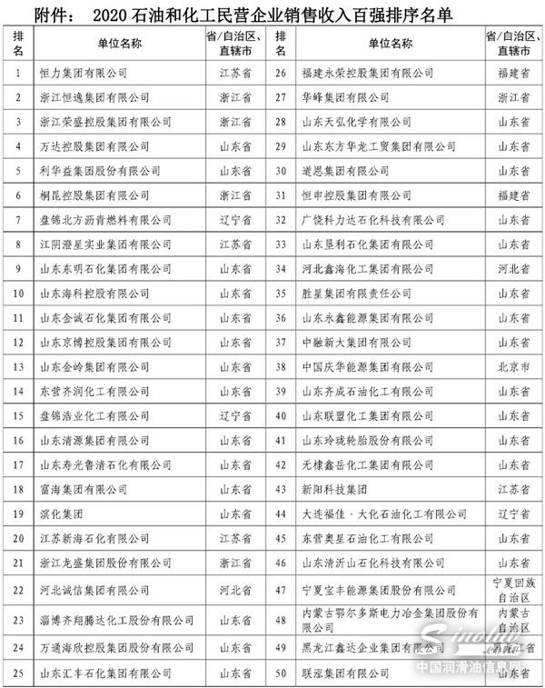 2020中国石油和化工民营企业百强名单近日公布,恒力集团有限公司、浙江恒逸集团有限公司、浙江荣盛控股集团有限公司分列前三位。第4~10名依次是:万达控股集团有限公司、利华益集团有限公司、桐昆控股集团有限公司、盘锦北方沥青燃料有限公司、江阴澄星实业集团有限公司、山东东明石化集团有限公司、山东海科控股有限公司。