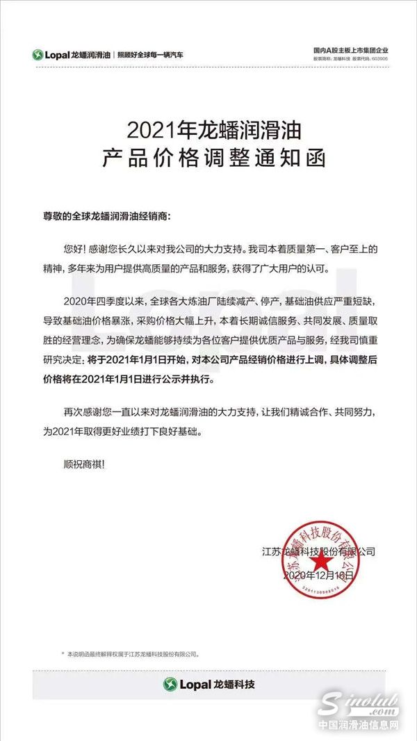2021润滑油涨价第一枪从这里打响!据中国润滑油信息网获悉,12月16日,龙蟠科技向全球龙蟠润滑油经销商发出《2021年龙蟠润滑油产品价格调整通知函》。函件表示,2020年四季度以来,全球各大炼油厂陆续减产、停产,基础油供应严重短缺,导致基础油价格暴涨,采购价格大幅上升,本着长期诚信服务、共同发展、质量取胜的经营理念,为确保龙蟠能够持续为各位客户提供优质产品与服务,研究决定:将于2021年1月1日开始,对本公司产品经销价格进行上调,价格将在2021年1月1日进行公示井执行。