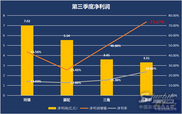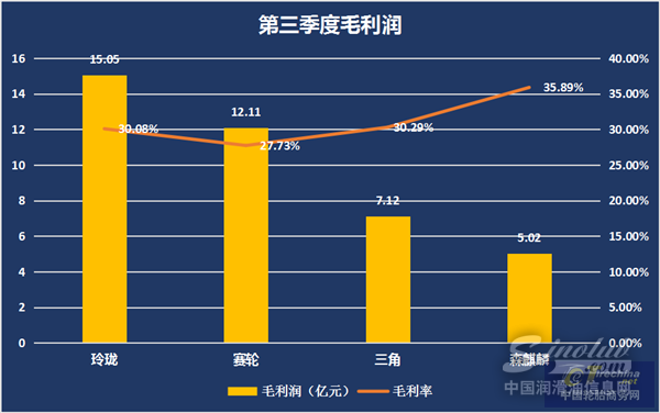 从上表我们看出,森麒麟在净利润和毛利润的绝对值上虽还未达到玲珑、赛轮的规模,但各项数据的增幅却都位居第一。其中第三季度净利润的增长率更是达到了73.47%。可以说在第三季度的轮胎财报中,森麒麟这份答卷异常的靓丽耀眼。