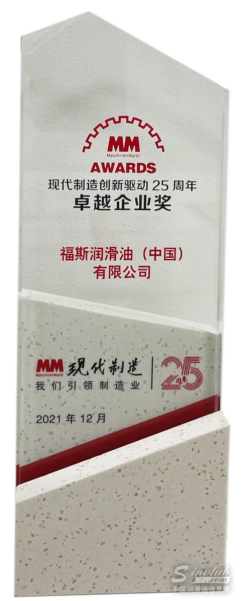 2021年12月16日,福斯润滑油受邀出席由MM《现代制造》主办的“中国制造2025企业家国际论坛暨现代制造、创新驱动25周年颁奖典礼”,并荣获“卓越企业奖”、“智能化解决方案奖”两项殊荣。