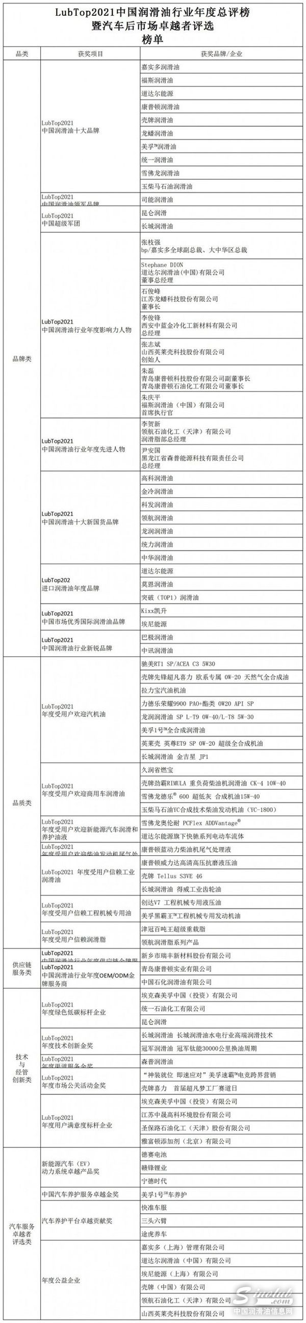 3月28日,万众瞩目的“LubTop2021中国润滑油行业年度总评榜暨汽车后市场卓越者评选”颁奖盛典云端全球发布。以“破维,拓新局”为主题的“LubTop2021总评榜”由中国润滑油信息网 (www.sinolub.com)、《润滑油市场》杂志发起主办,法兰通联展览(北京)有限公司(AMR中国国际汽保汽配展主办方)联合主办,业内权威机构和众多主流媒体支持协办,对包括在设备润滑和汽车服务市场表现优秀卓越的润滑油产业链相关产品和服务进行荣誉认证。据组委会介绍,评选活动以技术创新、市场表现、用户满意度、行业影响力等四大维度为品牌核心评价体系。在企业申报资格海选,第三方权威机构质量检测结果(一票否决权)基础上,通过线上用户投票、专业市场调研、专家导师团评审、媒体观察评议流程,以线上线下大数据+智能算法产生LubTop品牌荣誉指数,确定LubTop2021总评榜暨汽车服务卓越者榜单。全球一线润滑油品牌嘉实多、美孚、壳牌,中国超级军团长城润滑油、昆仑润滑等世界五百强企业品牌获得“LubTop总评榜”行业大奖。