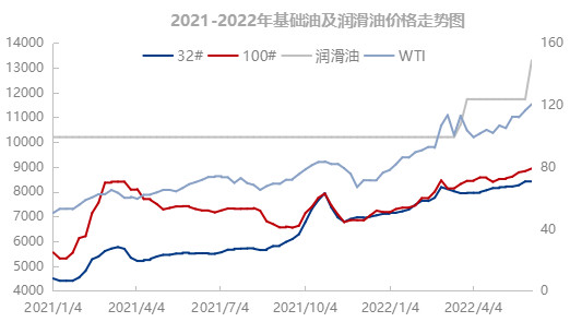 受此影响,基础油生产成本跟随增加,2022年WTI半年均价同比增加63%,涨幅39.2美元/桶,按照炼白油的加工成本来看,成本增加1960元/吨。