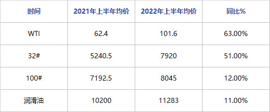 32#工业白油2022年半年均价在7920元/吨,同比上涨51%,涨幅2697元/吨。100#工业白油同比上涨12%,涨幅在852元/吨。按照32#及100#的出油率来测算,白油年均价涨幅在2131元/吨左右。由此可见,市场的上涨幅度基本是因为国际油价的大幅上涨导致。