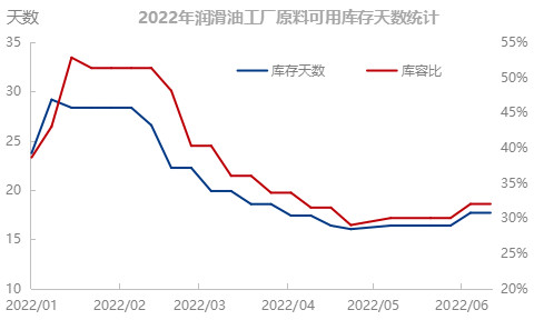 因原材料价格不断推高及终端用油需求低迷,润滑油工厂上半年采购基本按需采购。从采集的100家润滑油工厂的库容比数据来看,2022年1-2月润滑油工厂都有一定的备库,库容比在50%左右。原料(基础油)库存可用天数平均在30天以上。随着3月份价格不断推广,润滑油工厂采购谨慎,基本按需采购库存比逐渐维持在3成左右的安全生产线,原料库存天数维持在15-18天左右。