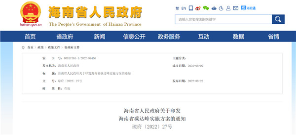 8月22日,海南省人民政府官网发布《海南省碳达峰实施方案》。
