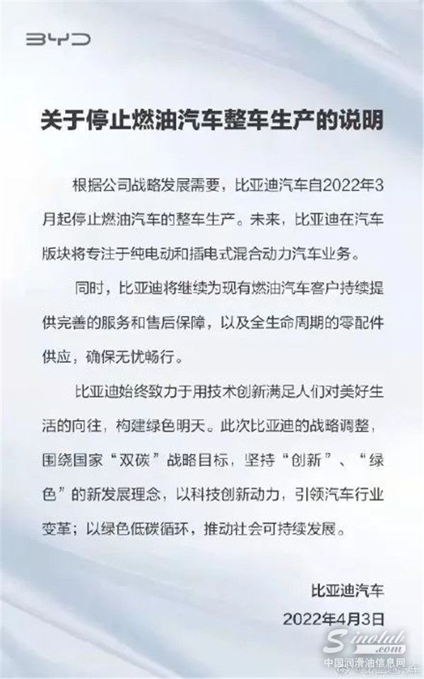据比亚迪微信公众号4月3日消息,比亚迪汽车官方正式宣布自2022年3月起停止燃油汽车的整车生产。作为全球首个正式宣布停产燃油汽车的车企,未来比亚迪不仅将以技术创新持续引领汽车产业变革,还将继续助力绿色低碳循环。